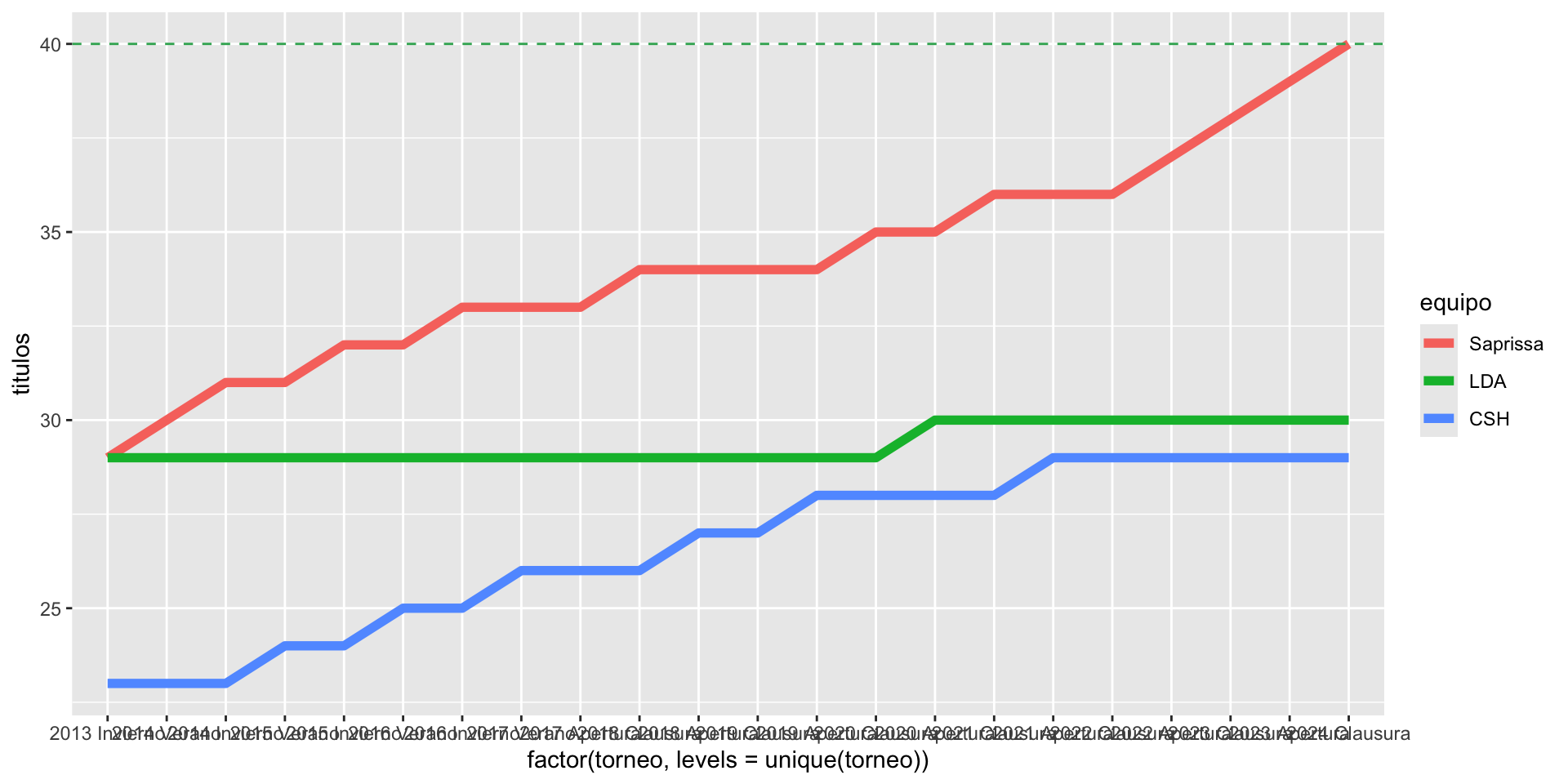 plot3 limita las marcas a aquellas que corresponden a los torneos Verano 2014 y Clausura 2024, ya que esos son los dos torneos que fijan la década en la cual la Liga Deportiva Alajuelense experimentó su debable deportiva.