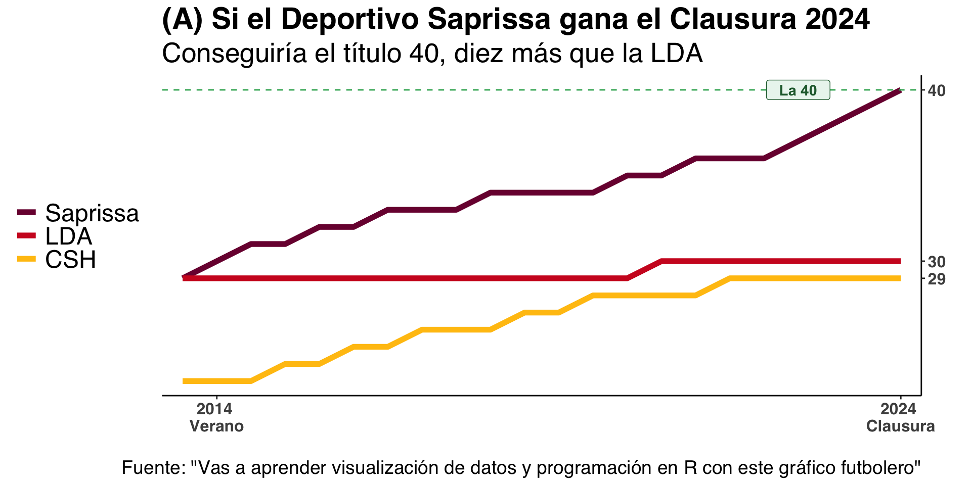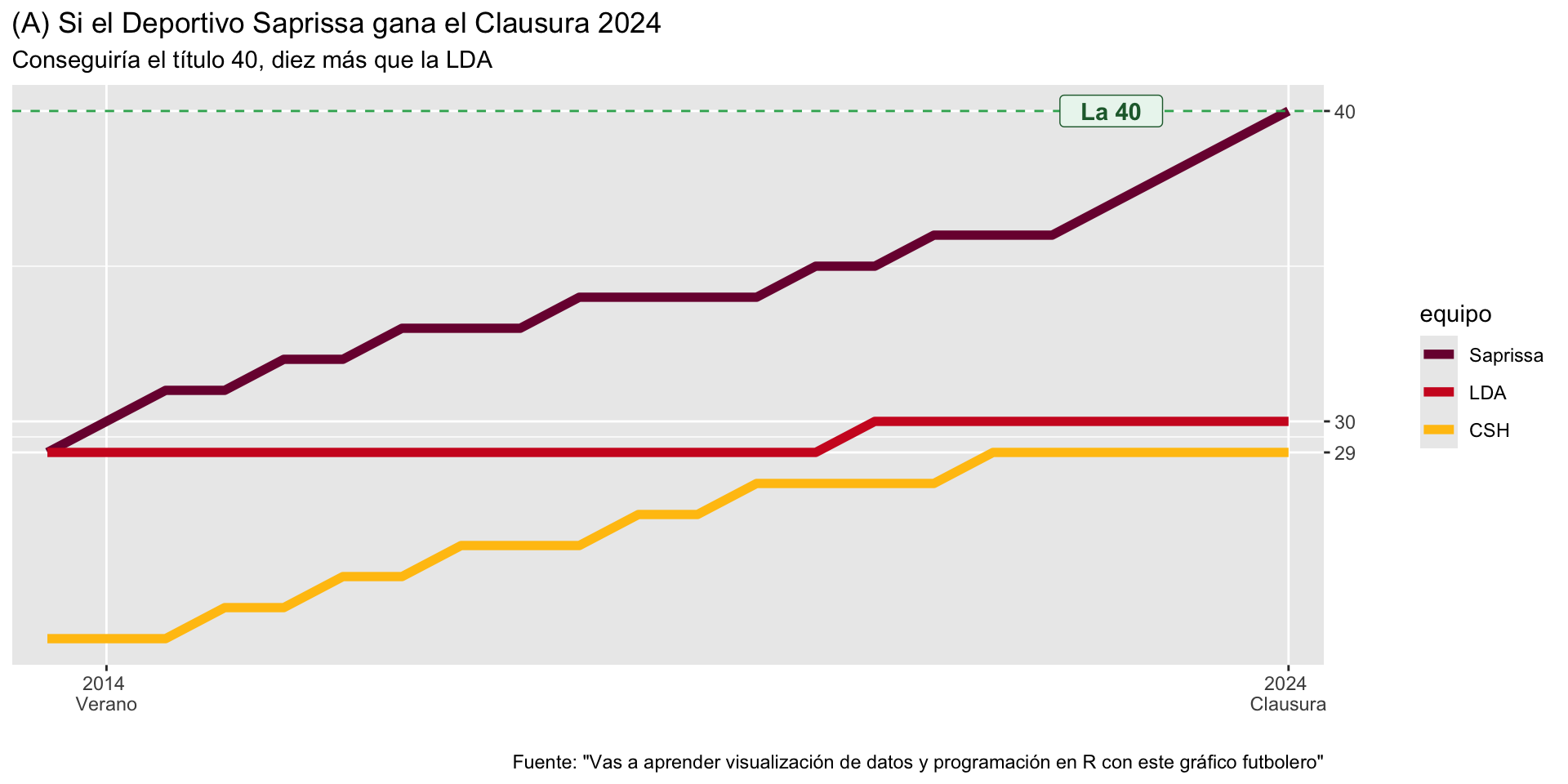 - Incluir títulos y subtítulos que permitan a la visualización explicarse por sí sola. El gráfico tiene un título y un subtítulo que se refuerzan mutuamente. Damos por un hecho que el público meta está familiarizado con el fútbol de Costa Rica. Si no fuera el caso, ajustes adicionales serían necesarios.
